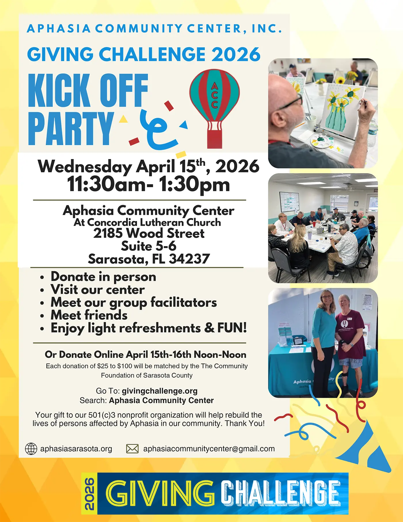 Giving Challenge 2026 is almost here, and it is the most extensive fundraising event for the Aphasia Community Center, Inc. The Giving Challenge takes place on April 15 and 16, 2026. The Community Foundation of Sarasota County sponsors this 24-hour event beginning at noon on April 15th. The Patterson Foundation matches all online donations between $25 and $100 made by different donors. Over 800 not-for-profit organizations take part in the Giving Challenge.